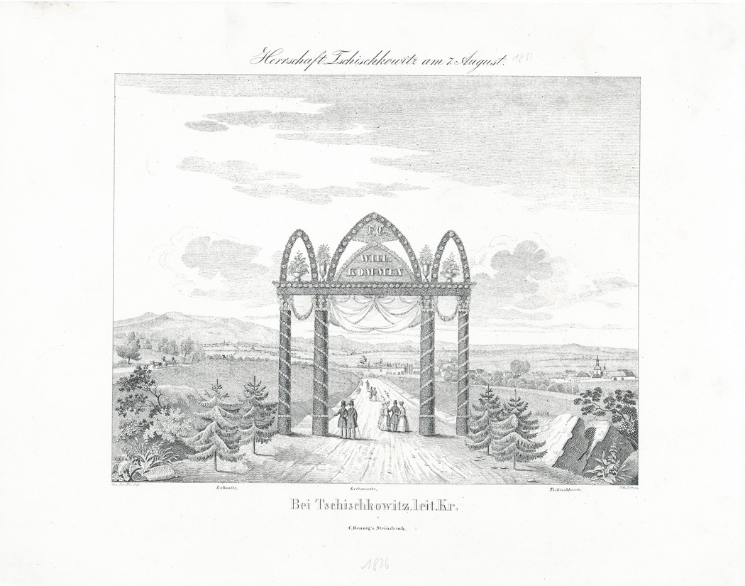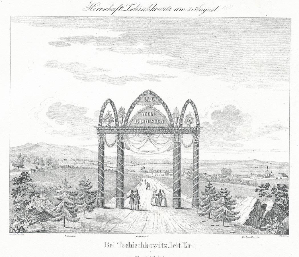 list ze souboru dokumetujícího návštěvu císaře Františka I. a jeho ženy Caroliny Augusty v Čechách (1833) většina lokalit byla vyzdobena ( osvětlena ) oslavnými nápisy a slavobránami .