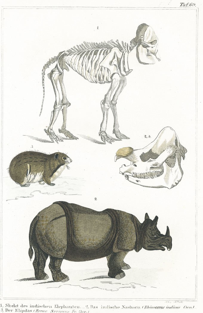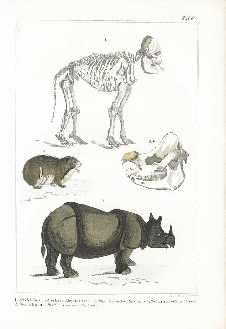 Hroch a sloní kostra, kolor. litografie, (1860)