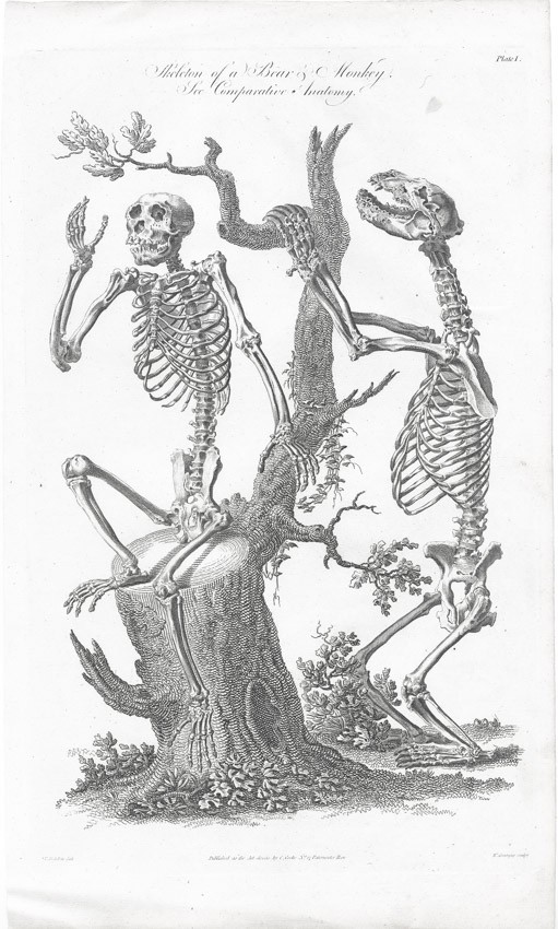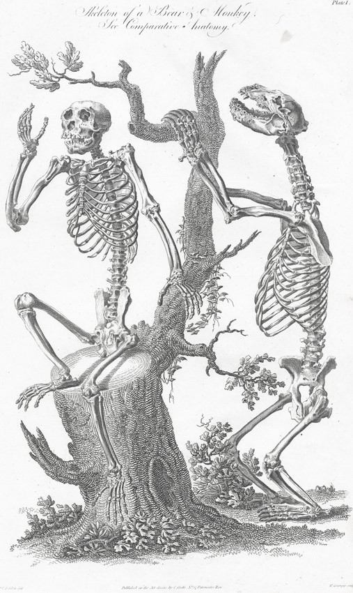 Opice a medvěd kostry, Grainger, mědiryt, 1795