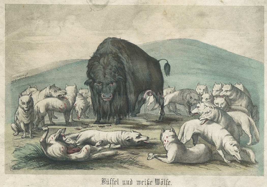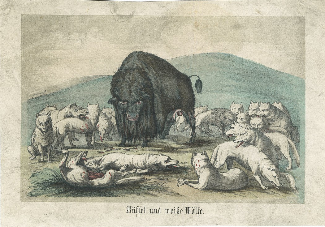 Bizon a bílí vlci, Catlin, kolor. litografie, 1848