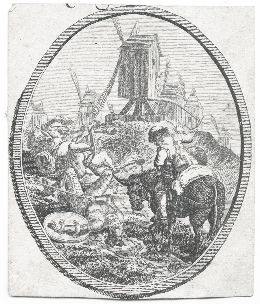 Don Quijote bojuje s mlýny, mědiryt, 1840