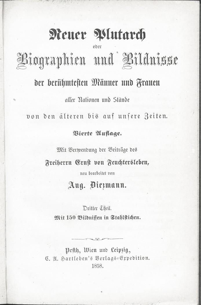 - název: Neuer Plutarch oder Biographien und Bildnisse der berühmtesten Männer und Frauen aller Nationen und Stände von den älteren bis auf unsere Zeiten, vierte Aufl. mit Verwendung der Beiträge des Freiherrn Ernst von Feuchtersleben ...Dritter Theil