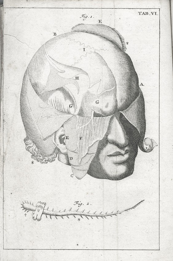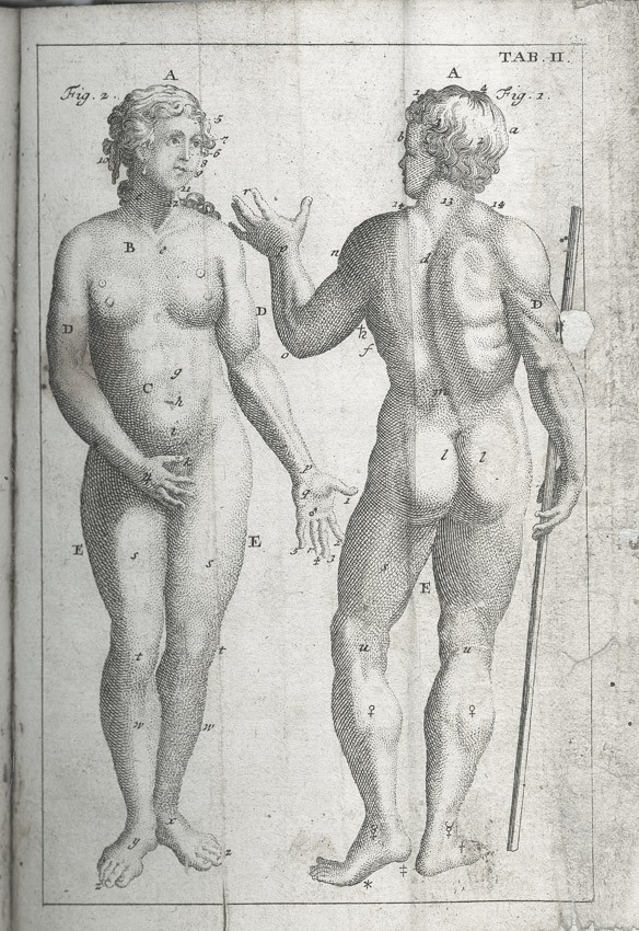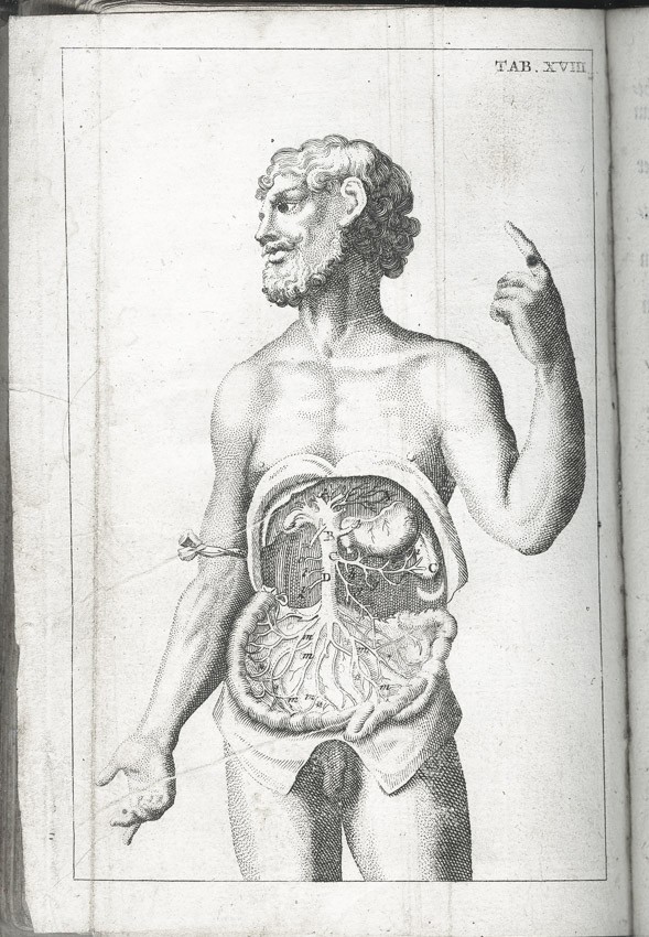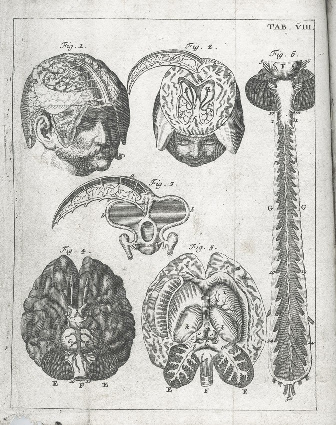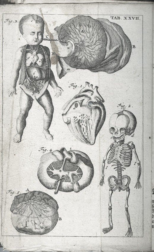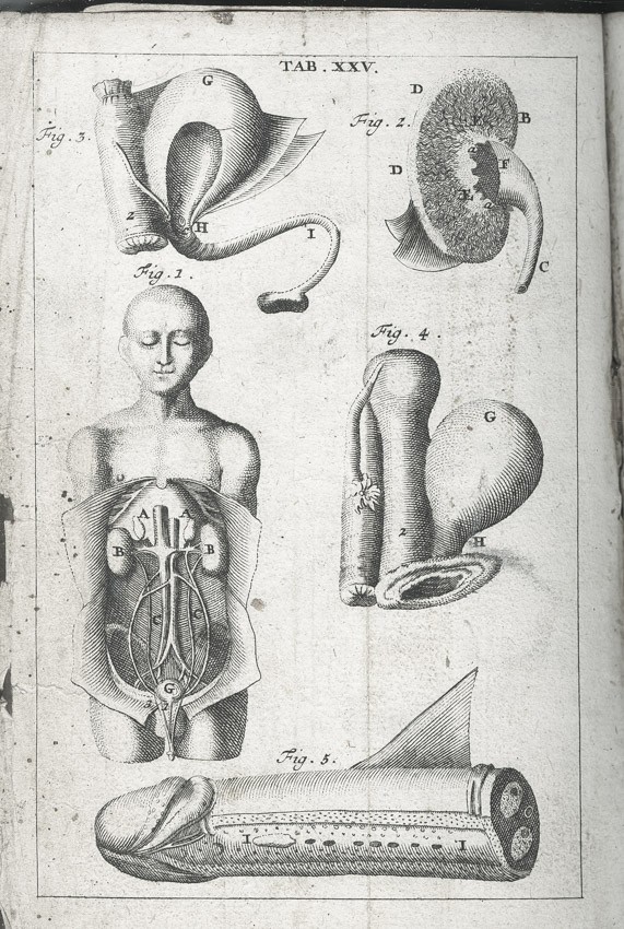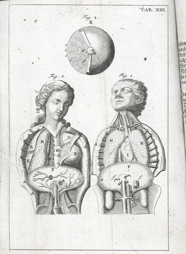 Frontispis - Pohled do knihovny na probíhající pitvu, ), dále jako přílohy 25 složených listů-mědirytů (Tělo ženské a mužské, Tepny, Kosti, Kostra; Hlava, Ústa; Mozek a nervy, Oči, Uši, Nos, Jazyk,Hrudník, Plíce, Srdce, Krevní oběh, Krevní proud v dutině břišní, Dutina břišní, Trávicí ústrojí,Mléčné žlázy, Slinivka, Játra, Ledviny a močový měchýř, Rozmnožovací soustava, Vývoj dítěte, Svaly) a 3 složené listy - Tabulky názvů částí lidského těla,
