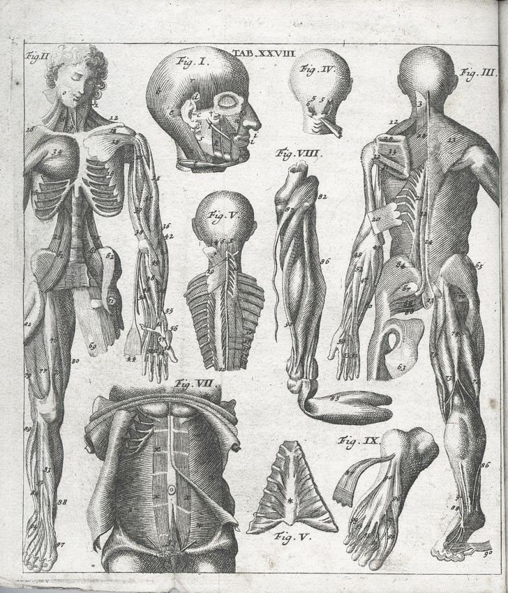 - počet stran: [8], 194, [16] stran, Front, 25 složených anatomických mědirytin ( z 28) tabule I., XVII., XXIII. chybi, rozměr knihy 17 x 10 cm
