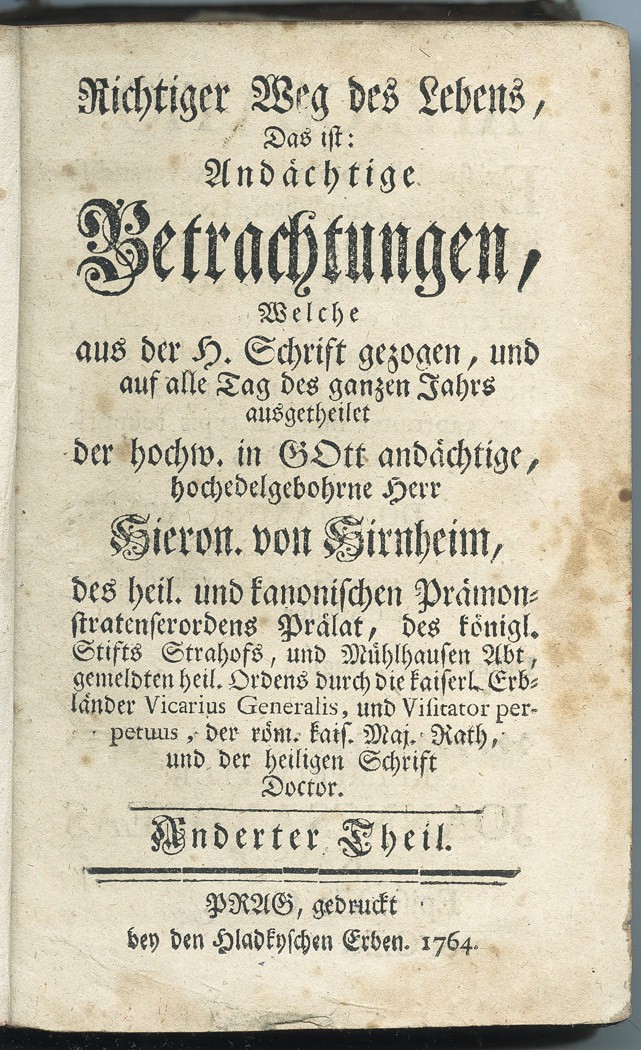 - název: Richtiger Weg des Lebens, Das ist: Andächtige Betrachtungen, Welche aus der H. Schrift gezogen, und auf alle Tag des ganzen Jahrs ausgetheilet. Anderter Theil