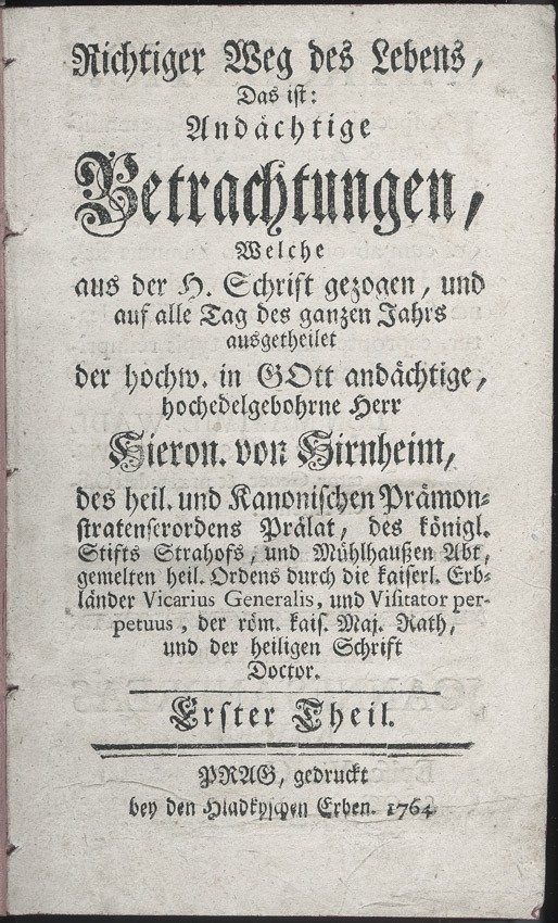 - název: Richtiger Weg des Lebens, Das ist: Andächtige Betrachtungen, Welche aus der H. Schrift gezogen, und auf alle Tag des ganzen Jahrs ausgetheilet. Erster Theil