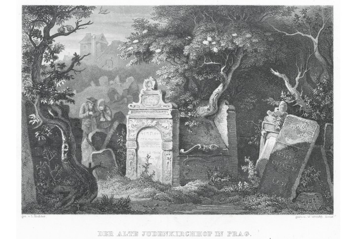 Praha židovský hřbitov, Herloss, oceloryt, 1841