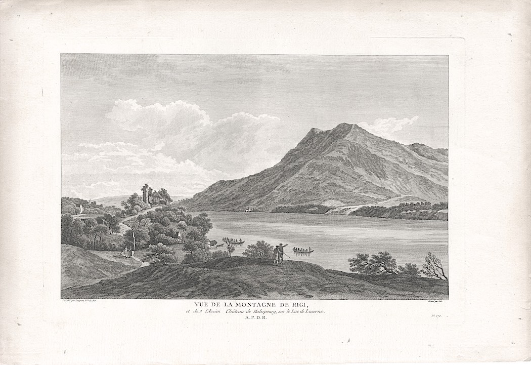 - RIGI. "Vue de la Montagne de Rigi, et de l'Ancien Chateau de Habspourg, sur le Lac de Lucerne". Blick über den Vierwaldstätter See auf den Rigi, links Seitenansicht der Ruine Habsburg.